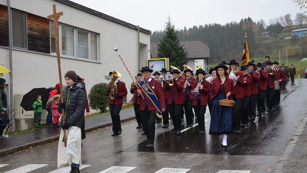 Zur Pferdesegnung nahmen die Reiter von der Kirchenstiege bis zur Kreuzung auf der Straße Aufstellung. P. Ewald würdigte die Pferde als Arbeits- und Freizeitgefährten des Menschen und vertraute im Segen die etwa 25 Pferde der Fürsprache des heiligen Leonhard an. Die Feuerwehrbuben teilten an die Rösser geweihte Brote aus. Da sich der Regen zunehmend mit Schneeflocken vermischte, traten die Reiter nach der Pferdesegnung den Heimweg an.