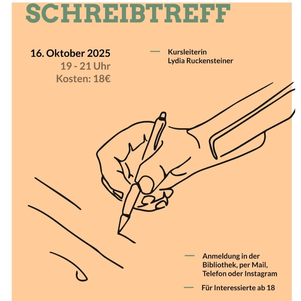 Bibliothek: Schreibtreff Donnerstag, 16. Oktober, 19.00 - 21.00 Uhr, Unkostenbeitrag 18. Euro; bitte um Anmeldung! mehr: Bibliothek: Schreibtreff