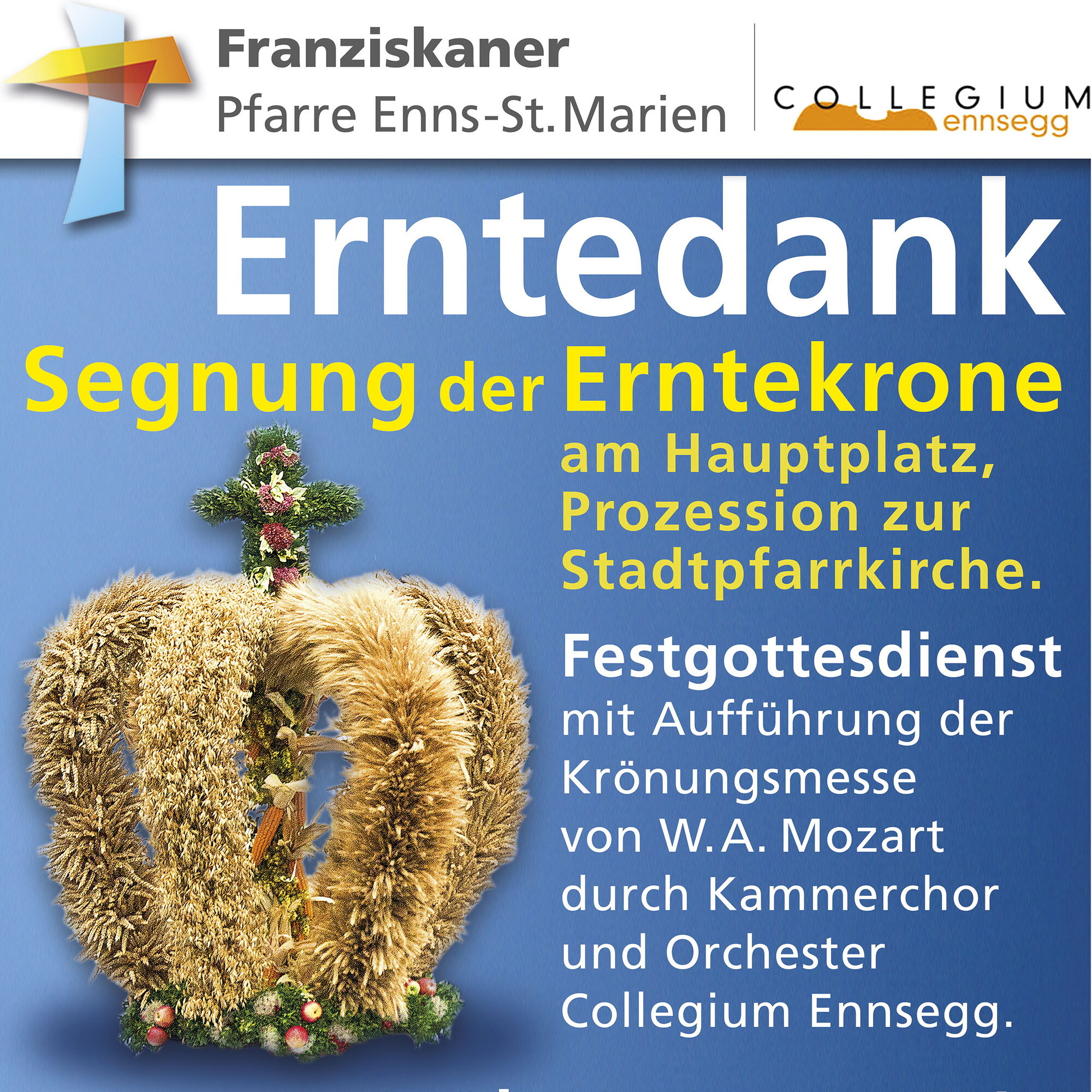 Erntedankfest - 12. Oktober, 9.00 Uhr. Beginn am Hauptplatz mit Segnung der Erntekrone. Prozession zur Kirche. Festgottesdienst mit Aufführung der Krönungsmesse von Mozart durch Kammerchor u. Collegium Ennsegg. Abschließend Agape am Kirchenplatz. mehr: Erntedankfest - 12. Oktober, 9.00 Uhr.